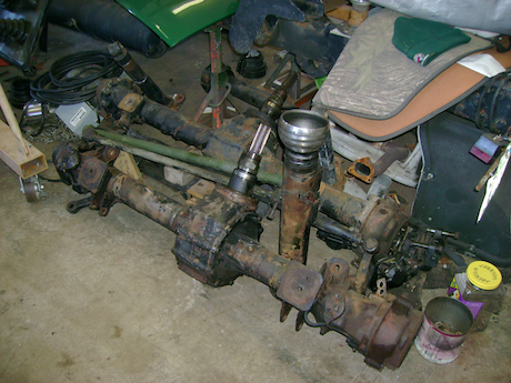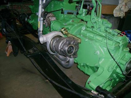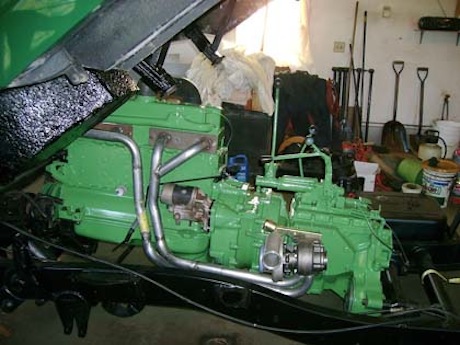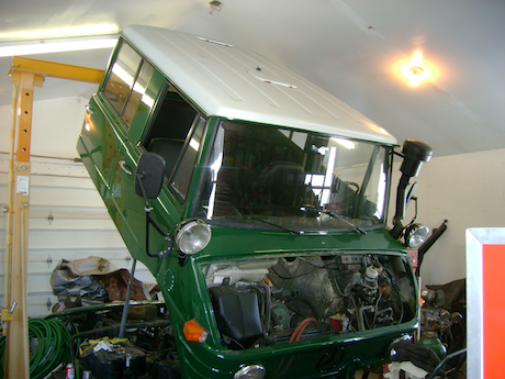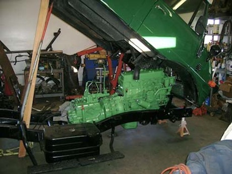| | This green 416 Doka is in for a turbo motor, 8 speed torque converter transmission, "Ultra fast" axles and stretched spider frame so the three way dump box will work with the long frame. Will be getting two hydraulic winches, one up front, one in the rear. Should be done by the summer. |