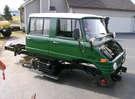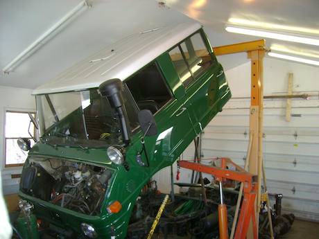 Currently undergoing a full frame off restoration is this White 416 DoKa. It will have a 352A turbo motor installed with a rebuilt 16 speed air shift transmission out of a SEE Unimog behind it. The motor with a larger turbo and intercooler should be putting out over 200 HP. and with Ultra fast axles of 4.928/1 ratio giving a top speed of over 80 MPH! Right now the cab has gone through a full restoration with rust removal and repair. The roof has been raised 2" as well. The chassis is being done at this time and soon hope to have it all together! Keep checking in to see the progress on this project.